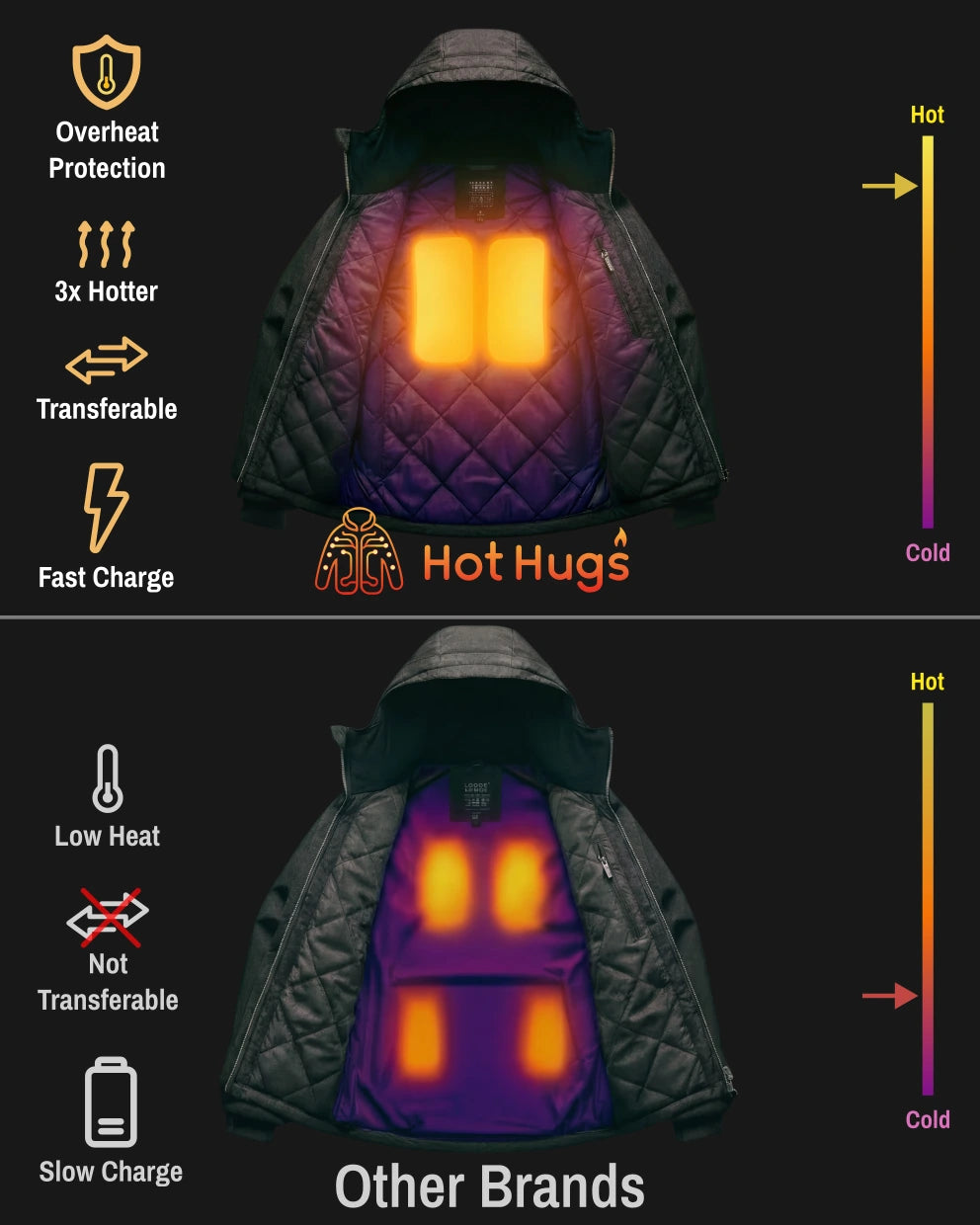 Get real warmth in any jacket. Hot Hugs runs 3× hotter than typical heated jackets and turns your favorite jacket heated in seconds.