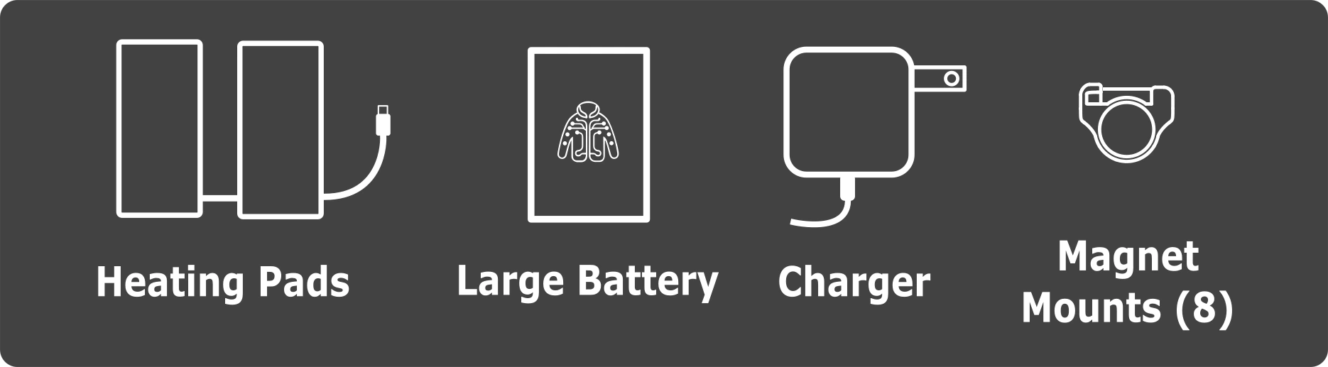 Simply pin the magnet mounts inside your jacket, snap on the heating pads, and plug into the battery.